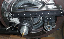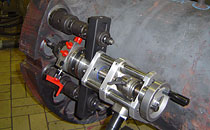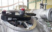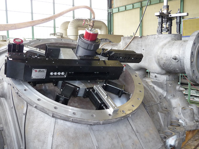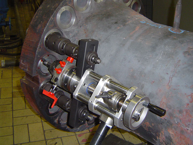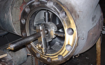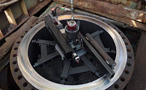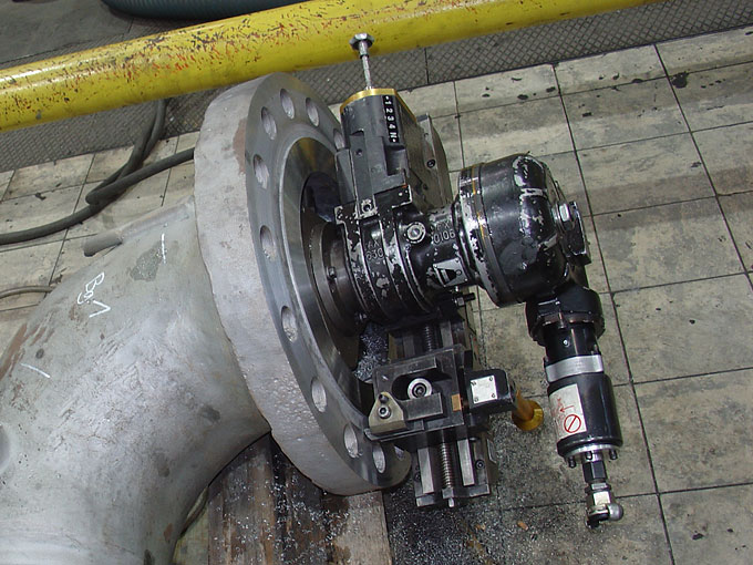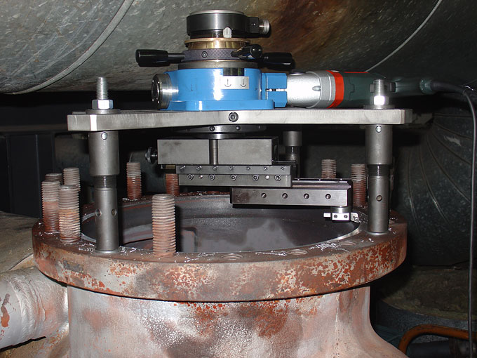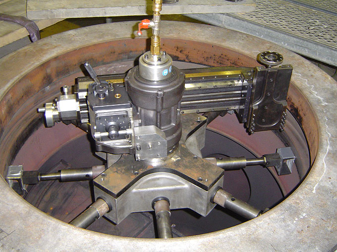 Mit unseren mobilen innen- und außenspannenden Drehgeräten führen wir dreh- und schleiftechnische Arbeiten bis zu einem Durchmesser von 4.500 mm durch, z.B. an planen und konischen Zylinderflächen, Radienflächen, Rezessen, Nuten und Hinterdrehungen. Je nach Platzangebot sind die Bearbeitungsarten variabel.