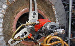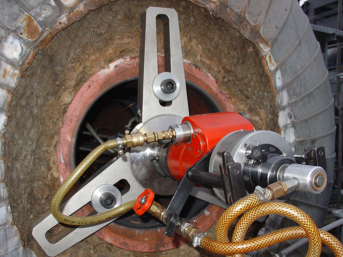 Zur Bearbeitung von ovalen, innenliegenden Dichtflächen (für Mannlöcher, in Tanks, in Kesseln, in Wärmetauschern und in Druckluftbehältern) werden unsere Maschinen von außen angebracht, ausgerichtet und bedient. Wir bearbeiten Bereiche von Ø 250 mm bis 600 mm Durchmesser.