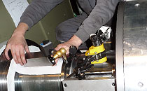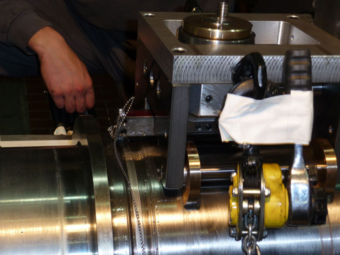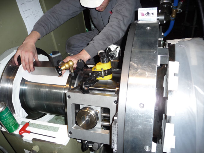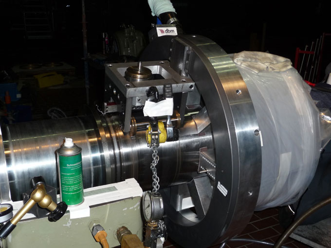 Die Wellenzapfenbearbeitung vor Ort wird auch als Umspindeln bezeichnet. Wir bieten diese mobile Bearbeitung ab Ø 60 mm bis Ø 750 mm und einer maximalen Drehlänge von 200 bis 700 mm an. Dabei befestigen wir die Maschine stirnseitig an der Welle oder dem Zapfen und richten sie mittels Druckschrauben in alle Achsen aus.